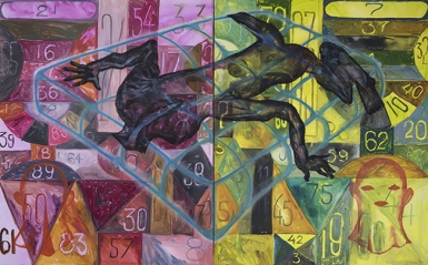 한국에서 두번째로 선보이는 개인전 ‘Treed Codependency’는 단골 소재인 얼굴 없는 남자부터 인간의 몸을 공유하는 새, 숫자와 도형, 칼날과 포박용 도구들, 가면, 배설물에 이르기까지 생경스러운 조합의 수상한 풍경을 펼쳐낸다. ‘공의존’ (codependency)은 타인과의 불균형적인 관계맺기가 초래한 자아의 부재로 인해 서로에게 역기능적으로 의존하게 되는 관계를 이르는 심리학 용어다. 실제로 관계의 근본이 되는 ‘공감’과 같은 심리적 현상은 대상과의 간극을 이어주는 역할을 하면서 동시에 자아를 억압하는 기제로 작용하기도 한다.