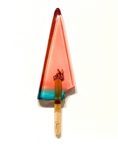 Life in Icecream, Sweet mate, Colored epoxy resin, human miniature, wood, 36x33x4.5cm, 2022