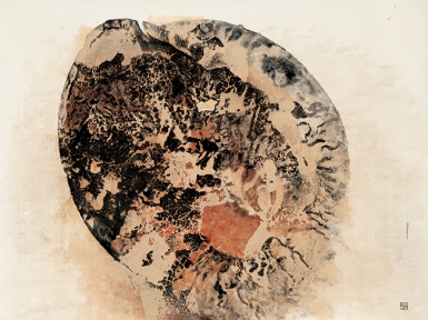 철모, 2018, 140x193cm, 한지에 흙, 먹, 유화물감