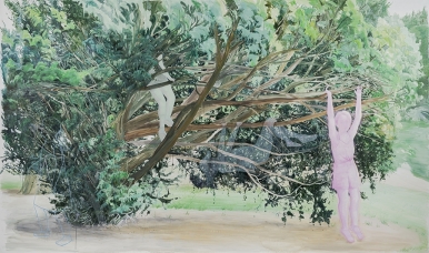 가로 길이 3미터가 넘는 대형 신작 〈머물다 지워진 시간〉(2024)은 작가가 오랫동안 탐구해 온 풍경화의 연장선에 위치하는 듯 보인다. 아름드리나무는 현실 스케일을 닮아 평면을 넘는 공간감을 확보하며 작품과 관객 사이 거리를 좁힌다. 그러나 인물로 시선을 옮기면 이야기가 달라진다. 오직 선과 면으로 희미하게 표현된 인물 형상은 큰 나무의 표현과 달리 단지 표면에 머무른다. 현실의 존재라기보다는 과거로부터 소환된 존재임을 암시한다. 이는 작가가 어린 시절 많은 시간을 보낸 숲에 대한 기억 한 조각이다. 나무에 매달려 놀고 있는 인물은 단연 작가 자신이다. 우거진 나무 아래에서 혼자 놀며 자연을 만끽했던 시절을 회상하는 일, 흘러간 시간 너머를 반추하는 일에는 잔잔한 상실과 공허가 따른다. 눈앞에 있었던 풍경을 중심축 삼지만, 기억과 상상을 통과한 이미지가 덧대어지는 메커니즘에 기반하는 그의 회화엔 당연하게도 침잠의 정서가 전반에 깔린다. 박효빈의 작업이 갖는 고유의 분위기라 하겠다.