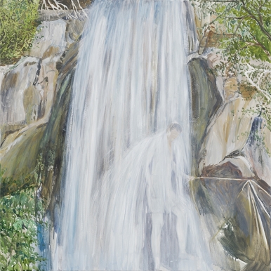 시선을 이동해〈 Paddle Boat Man 〉(2024)을 보자. 전작과 다른 변화가 전반에 녹아든 작업이라 하겠다. 일단 가시적으로 보이는 것은 터치의 변화이다. 두텁고 엷은 질감, 얇고 세밀한 선과 넓은 면 처리의 대비가 두드러져 정밀함과 간결함이 공존하던 이전의 방식을 가져가면서도 전체적으로 터치를 덜어내는 방향을 향하고 있음을 확인할 수 있다. 노를 젓는 남자는 오직 안면부에만 빛에 의한 음영이 들어가 있고 이외의 부분은 오직 선과 면으로만 그려져 모호함을 고조시킨다. 이 풍경이 단지 어떤 과거의 순간을 시각적으로 박제하기 위한 재현이 아님을 짐작해 본다. 비로소 풍경은 배경으로 한발 물러난다. 작업과 작업 사이 혹은 시공, 나아가 차원을 넘어 드러나고 사라지는 듯한 인물은 단지 풍경화로서 독해되어 온 박효빈의 작업에 또 다른 해석의 가능성을 암시하게 만든다. 그럼에도 불구하고 여전히 이 그림을 풍경이라고 주장하는 것이 가능하다면, 풍경에 대한 표상과 심상 사이 어드메를 떠올려 볼 수 있을 것이다. 〈너머〉(2024) 속 남자가 폭포수를 맞고 있는 모습인 건지, 혹은 다른 차원으로부터 건너오고 있는 것은 아닐지 문득 다시 생각해 보게 되는 순간이다.