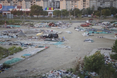 On the opposite bank of the Sava River, amidst New Belgrade—the largest urban development project after the Second World War, with initial plans drawn by architect Dobrović—lie the remnants of a film set. This set was constructed for Montevideo: Taste of a Dream, a Serbian historical drama that nostalgically portrays the Yugoslav national football team’s journey to the 1930 World Cup in Uruguay. Built as a detailed reconstruction of Belgrade’s Terazije Square in the 1930s, the set was meant to become a theme park, but the business failed and all but the central fountain was demolished. Fajfrić documents the site’s transition through various temporary uses, including an illegal Roma settlement, a flea market, construction site and a landfill.