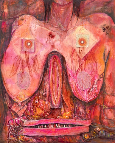 Gore Deco – Oh, Those Breasts, 2025, Oil, oil pastel, gauze, jute, human hair, transfer print on linen 162.2 x 130.3 cm Courtesy of the artist and Kukje Gallery 사진: 안천호 이미지 제공: 국제갤러리