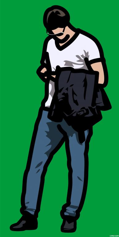 Man wearing dark glasses, texting with his jacket over his arm, Vinyl on wooden stretcher, 212.4x104cm, 2013