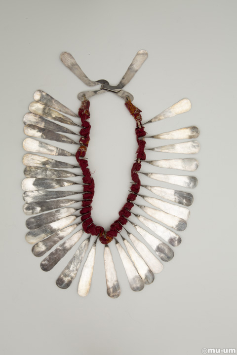 Necklace, Silver wire, cloth, and cord, loop: 15 1/4"; element: 3 3/4" x 3/4", 1940
