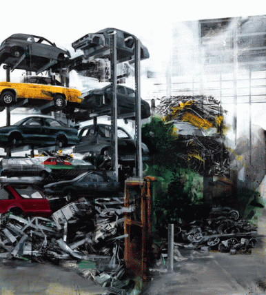 Ⅶ. 2007년 가을부터 이문주는 스튜디오프로그램에 참여하면서 베를린에서 활동하였으며, 특히 이곳에서 구동독 공화국 궁전의 철거작업이나 O2-아레나 건설에서 흥미로운 모티브를 찾았다. 두 건물이 합쳐진 이 그림에서, 동독 건축물의 특수한 철거 공법 때문에 약간 모순적인 느낌을 받게 된다. 그 건물은 해체되고 있지만 완전히 철거되지는 않아서, 계속 건물을 짓고 있는 듯한 인상을 준다. 마치 일반적인 건축 공사가 진행되는 것 같은 착각을 하게 된다. 다른 한 켠에서는 시간이 지나 폐허더미 위에 풀이 자라는 모습을 통하여 황폐화 되어가는 과정이 더욱 미묘하게 표현되고 있다.