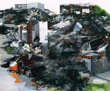 Ⅱ. 작가는 작품에서 인간의 주거공간이 해체된 후 남긴 것에 초점을 맞추었다. 예전에 살았던 사람이라던가 철거 인부와 같이 이 곳에 ‘있을법한 행위자들이’ 작품 속에 등장하지는 않지만, 그림 속의 광경은 인간이 살았다는 것을 보여주고 있다. 책, 이불, 가구, 신발, 그 무엇이든 거기 남겨진 것들 가운데서 그 곳에 인간이 살았다는 것이 수많은 형상으로 드러난다. 마치 쓰나미와 같은 자연재해가 휩쓸고 지나가며 모든 것을 황폐하게 만들고, 방금 전까지 쓸 수 있었던 물건을 무용지물 더미로 망가뜨려버린 듯한 인상을 준다.