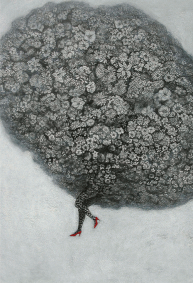 이번 전시에서 굽 높은 구두, 하이힐은 ‘빨간’ 이라는 형용사를 동반하면서, 양가성(兩價性)을 지닌 핵심적 이미지로 등장하고 있다. 작가의 작업 안에서 강한 생명력을 발산시키는 붉은 색과 삶의 불모성을 숨기면서 무화(無化)의 의지를 드러내는 붉은 색은 모순되는 하이힐의 이미지와 결합되어 있다. 외면화된 빨간 하히힐은 잠들어 있는 의식을 각성시키는 불꽃이지만(<달리는 집>, <연기나는 여자>, <의자>), 내면화된 빨간 하히힐은 인간의 유한성에 대한 공포를 불러 일으킨다(<강탈된 행성>, <불면증>, <정물>). 그래서 하이힐의 높은 굽은 정신의 치열함과 연관되지만, 하이힐 굽이 차지하는 좁은 바닥은 물질적 조건의 한계와 관계 맺게 되는 것이다.