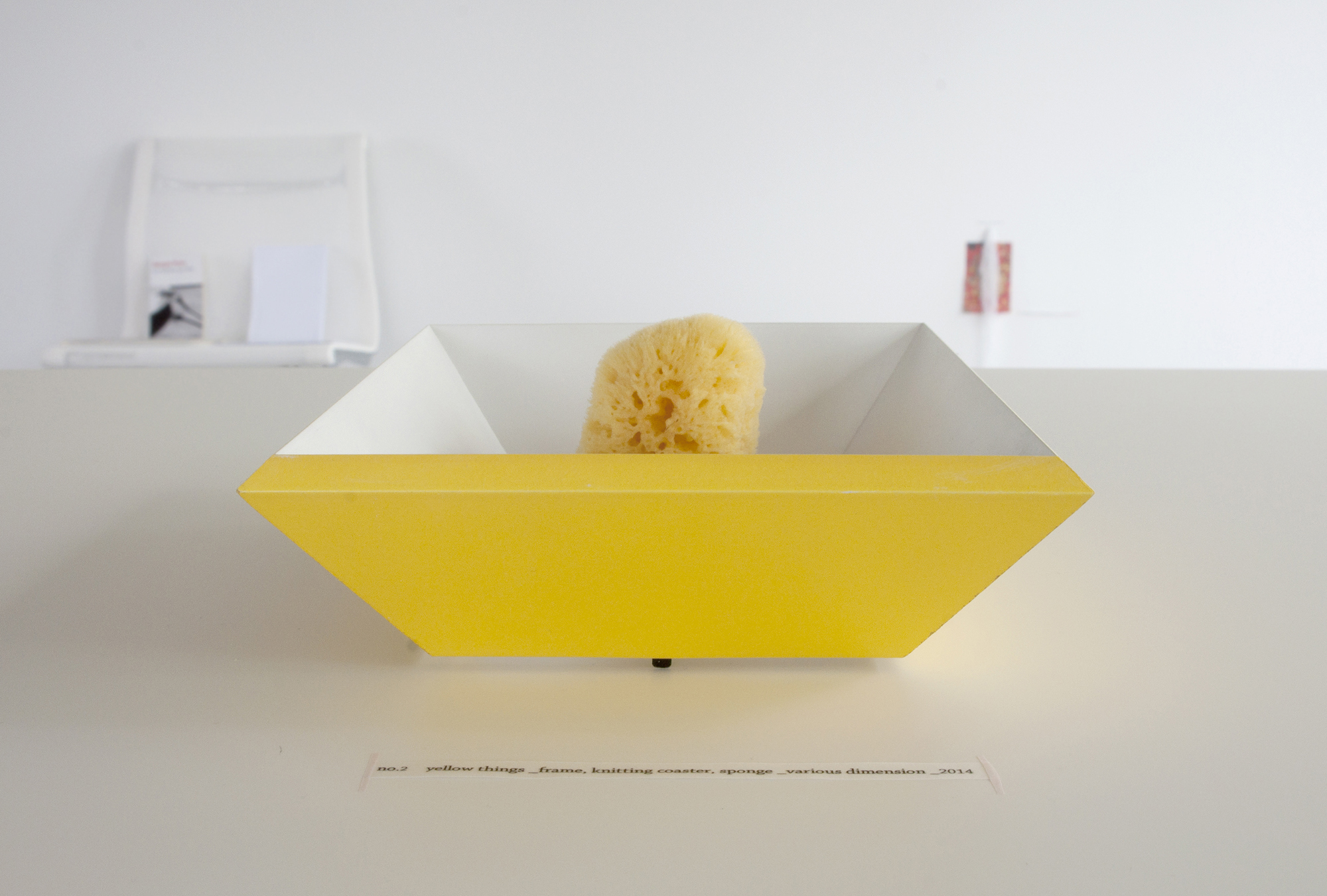no.2 yellow things _frame, knitting coaster, sponge, knitting coaster, sponge, 2014