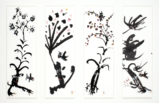 풀과 친구, 한지에 먹, 채색, 아크릴릭, 98×33cm×4ea, 2009