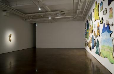 장종완, 제 말 좀 끝까지 들어 보세요 Please Wait until I have Finished, 2017, Oil painting on torn linen with cow hide rug, wood and resin, Painting 130.3x194cm, Cow hide rug 172x151cm