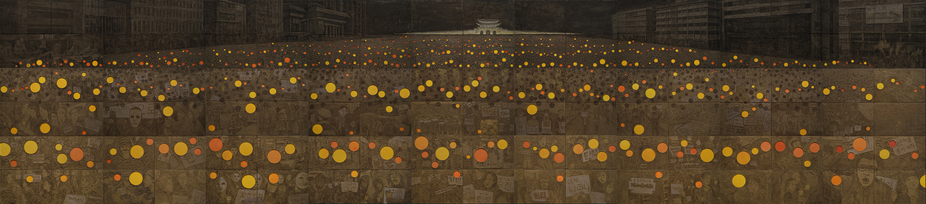 광장에, 서, 2017, 캔버스에 혼합재료, 360x1620cm (108 pieces)