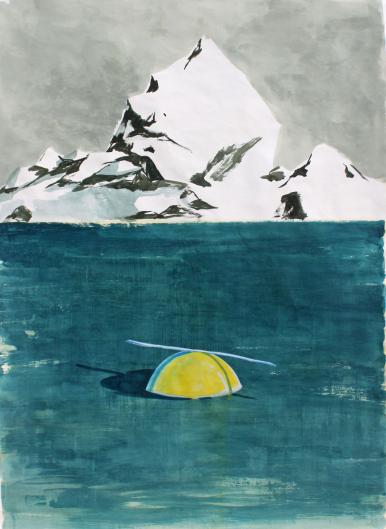 반쯤 잠긴 노란색 공, 장지에 혼합채색_147.2x207.8cm_2018