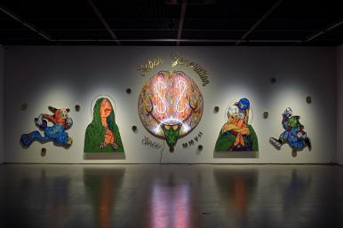 한도코 에코 사푸트로 Handoko Eko Sputro, Baby Booming, 2015-18, Neon sign, acrylic on canvas, play wood, brass, Dimensions variable