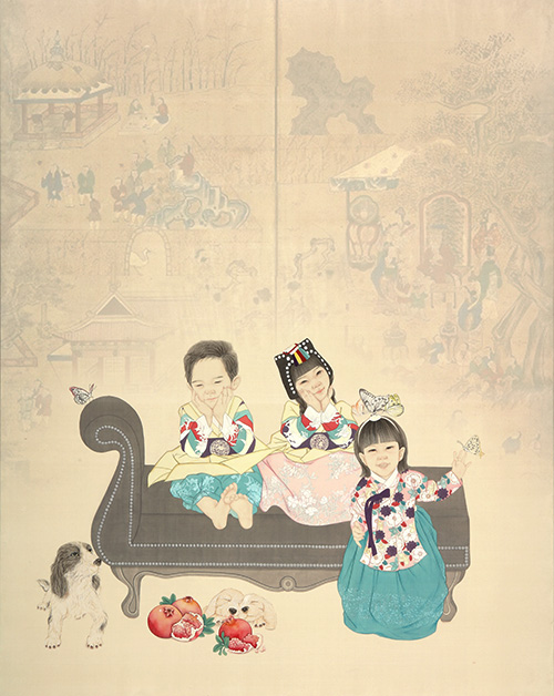 2018 동자도2, 2018, 160x127cm, 비단에 채색, 프린팅 배접