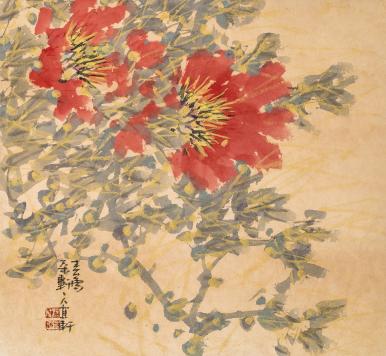 홍매 Red Plum Blossoms, 84x100cm, 한지에 수묵채색, 금니, 2022