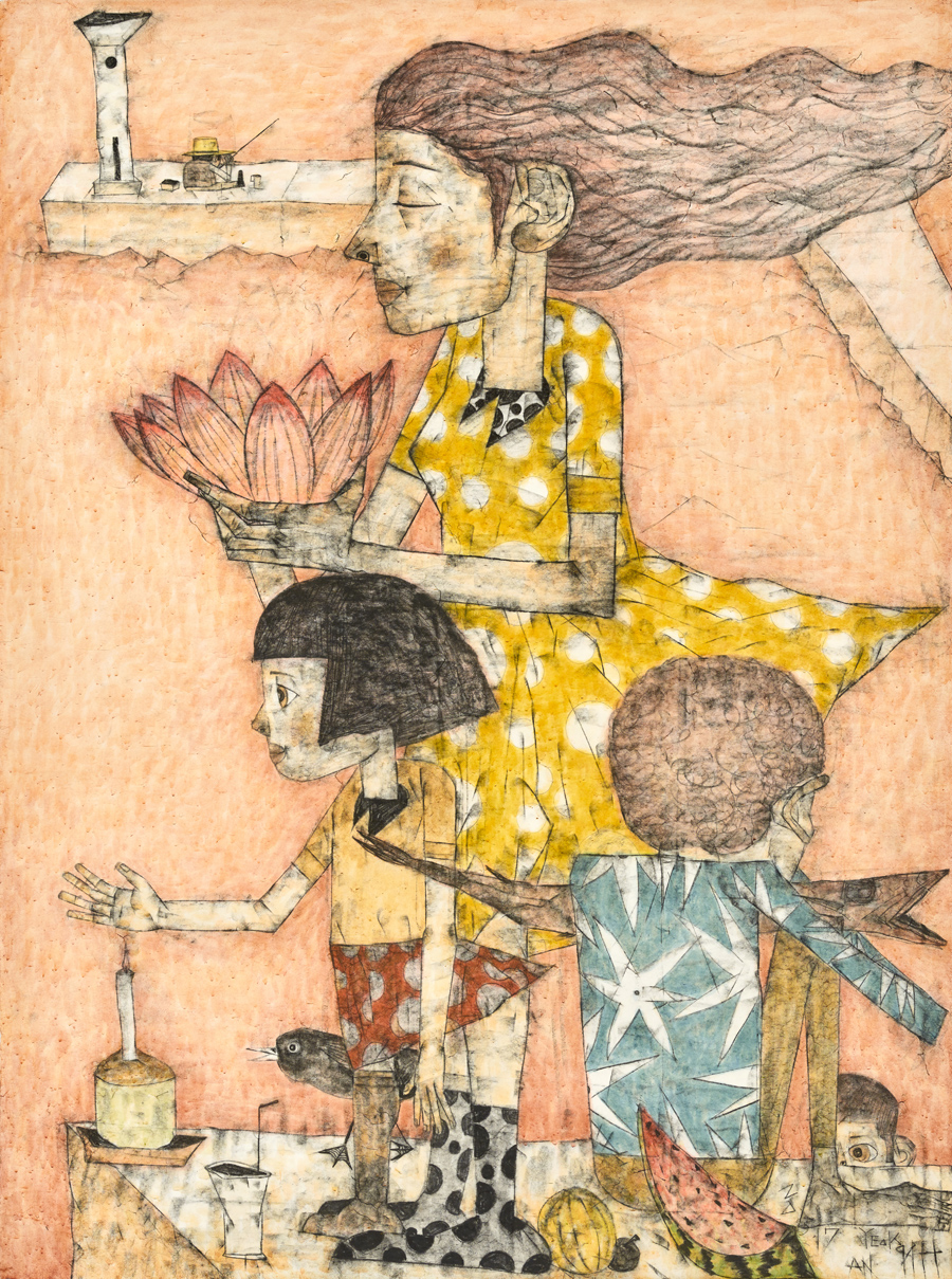 가족이야기09-5, 한지에 목탄채색, 72×60cm, 2009
