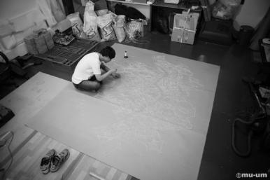 작업실에 온 일수, 광목에 일수 명함 가루/갈아낸 일수 명함_ 달력 각 69.5×49.5cm, 일수 명함 각 5.4×8.8cm_2016