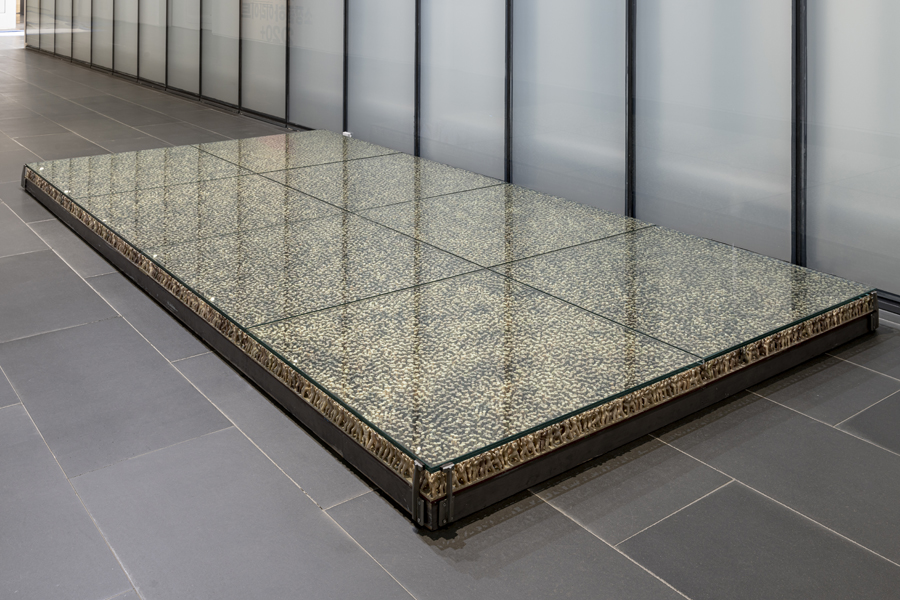 바닥, 1997-2000, PVC 인물상, 유리판, 석탄산판(phenolic sheets), 폴리우레탄 레신, 8x100x100x(8)cm. 국립현대미술관 소장