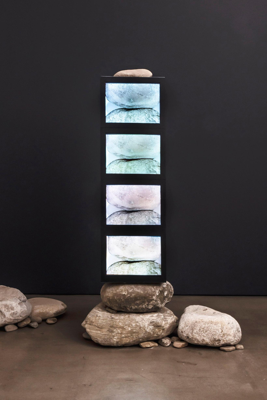 무제, 1986, 영상 설치; 단채널 영상, 컬러, 무음; 돌 21개, 모니터 3대, 207x51x46cm