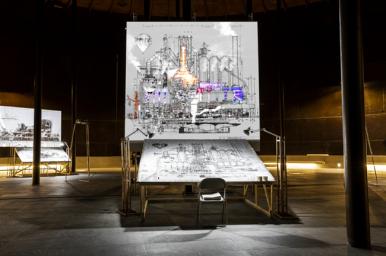 포항제철+당인리 발전소, 2019, 트레이싱지에 연필, 목탄, 포토 콜라주, 디지털 애니메이션, 프로젝션 매핑
