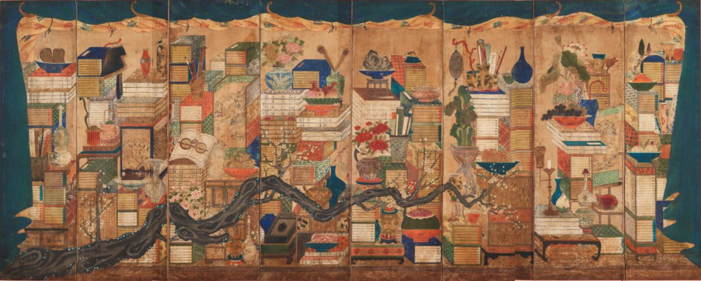 매화 책거리도(8폭 병풍), 19세기, 종이에 채색, 118x292cm, 개인 소장