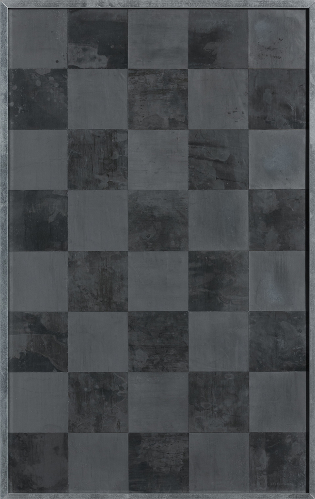 Untitled, 2001, leaf-lead on plywood, zinc plated steel frame, 122x77x3cm
