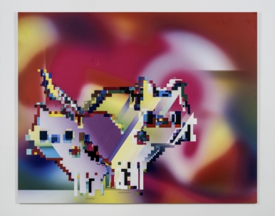 Database painting animal totem "Hello Kitty A3", 2022-2023, Acrylic paint on UV print canvas, 241 x 196 cm. Courtesy of the artist & PKM Gallery.