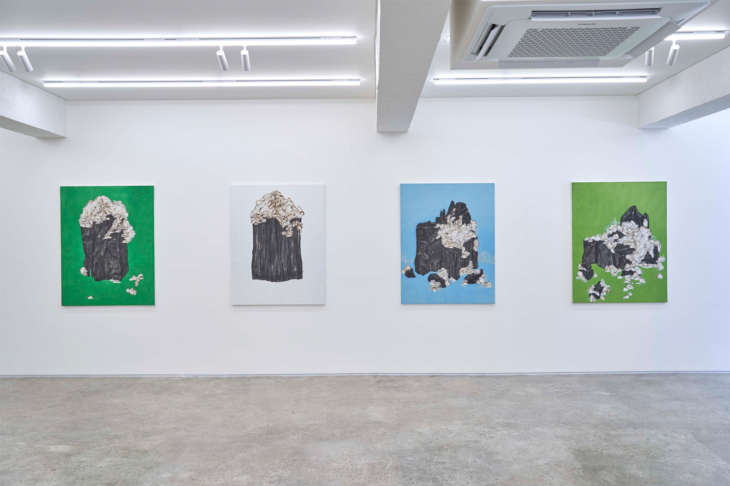 Landscape distancing, Landscape distancing, 숯에 한지꼴라쥬, pvc프린트, 라이터 34x46㎝ *4, 2022
