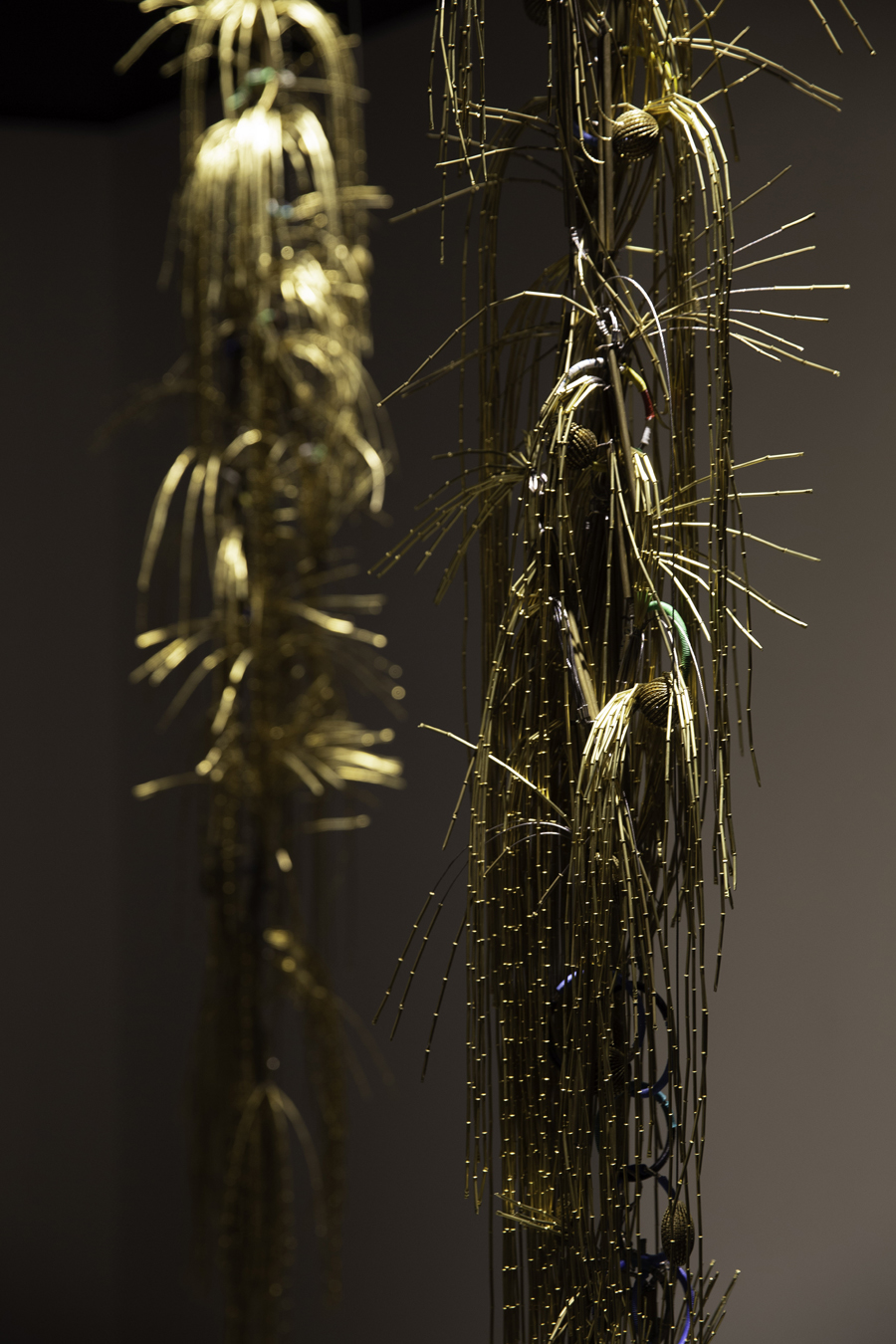 Alchemy, Transmutation of Matter (부분), 2023. 금색 구리 아일렛, 스테인리스 와이어, 고무 캡, 땅콩 껍질, 옻칠, 스테인리스 고리, 전선, 가변크기. © ONE AND J. Gallery and the artist.
