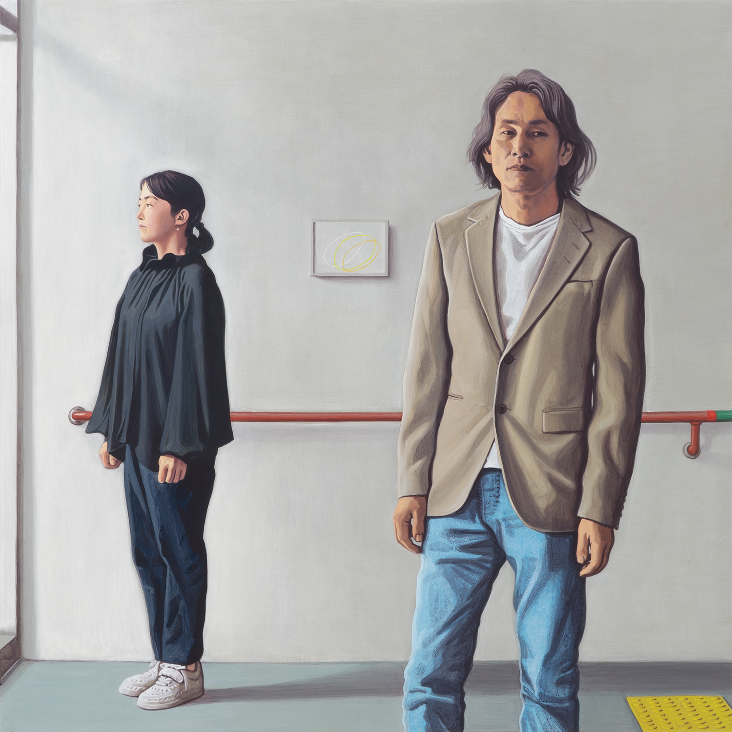 큰 창문 옆에 서있는 두 사람과 벽에 걸린 그림 Two People Standing by the Large Window and a Painting on the Wall, 2023, 캔버스에 아크릴릭 과슈 Acrylic gouache on canvas, 130.3x130.3cm @제공 학고재