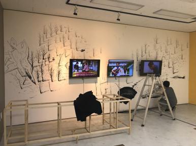 음모, Charcoal on wall 3 x 10m installation view of HONG Won-Seok 2017