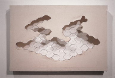 〈철망 통닭 #1〉, 1993, 캔버스에 철조망, 실, 58.5 × 87.5cm. 개인 소장. ⓒ김범., Chickenwire Chicken #1, 1993, chickenwire, thread on canvas, 58.5 × 87.5cm. Private collection. ⓒ Kim Beom.