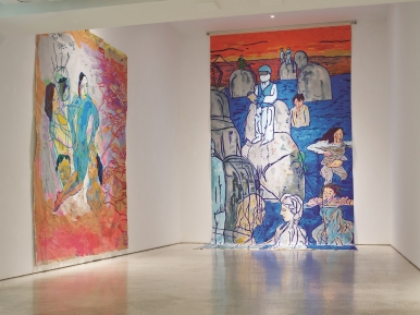 좌)죽는 게 소원인 자들, 2023, acrylic on canvas, 350×260cm, 우)핵좀비들ᅠ속에서ᅠ살아남기(중 부분), 2022, acrylic on cotton, 700×330cm