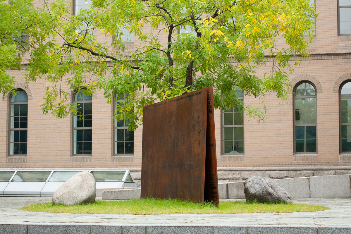 항(項)―대화, 2009, 철판, 자연석, 200×400×1.5cm(×2개), 50×87×60cm, 50×77×60cm. 서울시립미술관 소장, 2012-77. 이미지 제공: 서울시립미술관