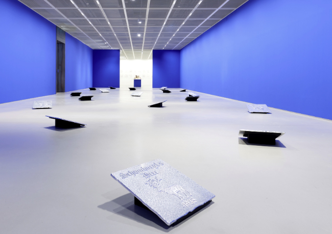 열 개의 액체 사건, 2010, 표면 가공하지 않은 유리 주물, 10개, 45.7 x 86.4 ~ 91.4 x 86.4 cm / (뒤쪽 벽) 올라퍼 엘리아슨 <도마달루의 일광 연작(북쪽)>, 2006