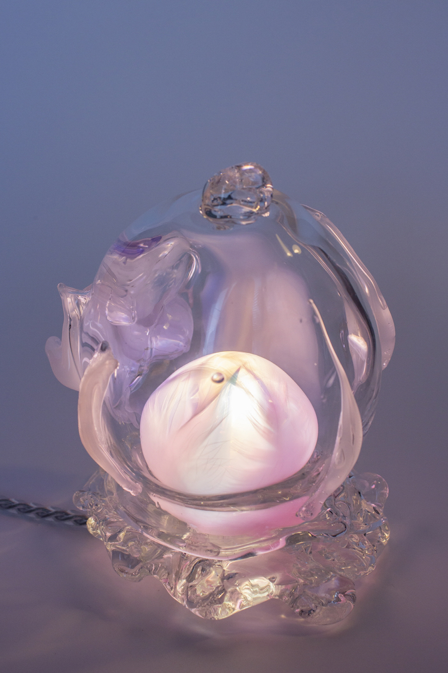 White Haze, 2024, 유리, led, 전선, 깃털, H14xW12cm