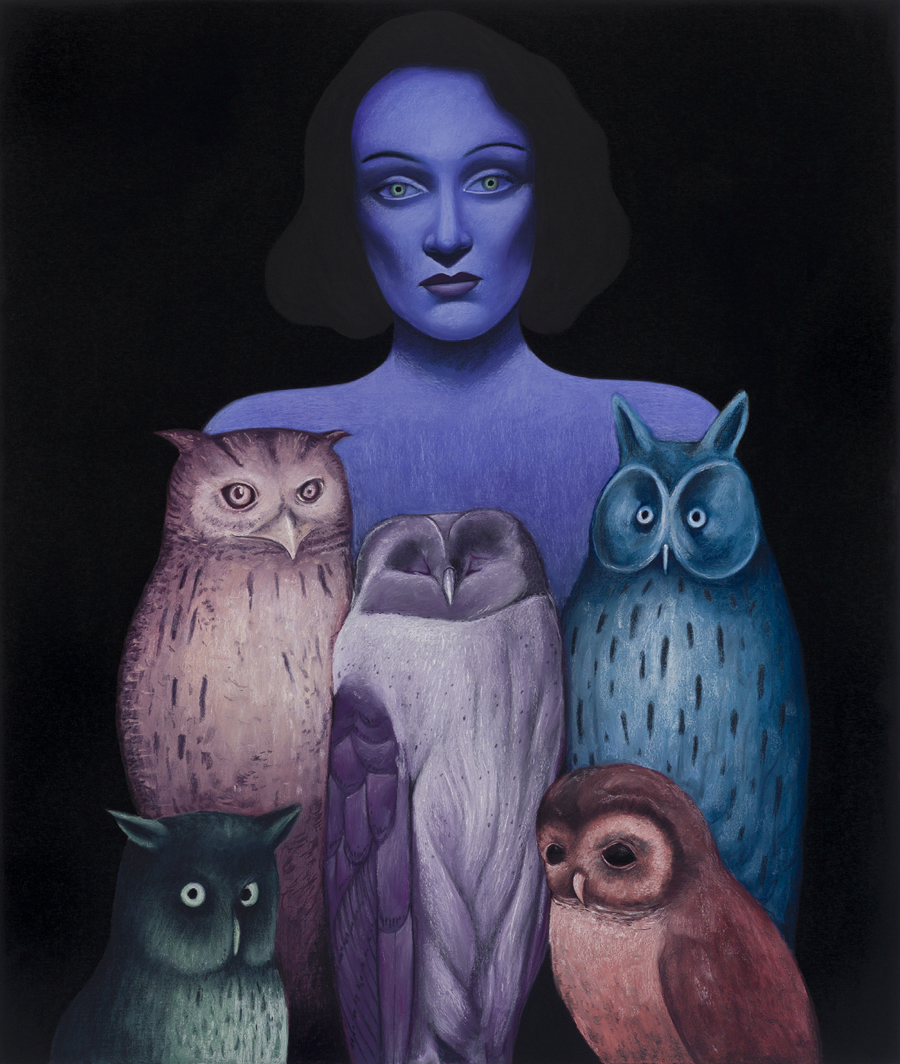 《니콜라스 파티: 더스트》 전시 전경 사진 제공: 호암미술관, 사진: 김상태, (뒤) 니콜라스 파티, 〈구름〉, 2024 벽에 소프트 파스텔, 350 x 800 cm 작가 제공. ©니콜라스 파티 (앞) 니콜라스 파티, 〈부엉이가 있는 초상〉, 2021 리넨에 소프트 파스텔, 149.9 x 127 cm 개인 소장. 하우저앤워스 컬렉션 서비스 제공. ©니콜라스 파티