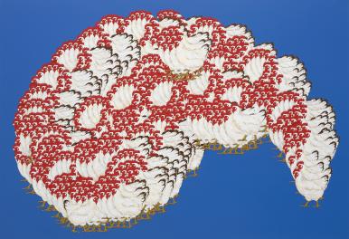Redundancy and Repetition(중복과 반복)이라는 전시 제목에 걸맞게 작가는 소와 닭 등, 인간에 의해 대량 생산, 소비되는 동물의 개체 하나하나를 그리는 작업을 되풀이하고 그것을 거듭하여 겹쳐 작품을 완성한다. 유제품을 좋아하는 아주 단순한 개인적 동기로부터 시작된 작품 한 점을 완성하는 데는 꼬박 몇 달이나 소요될 정도로 수고롭다. 마치 쳇바퀴 돌듯 매일 노동해야 하는 인간의 일상이 우리가 쉽게 소비하는 동물을 통해 대변되는 듯하다. 모두 한 방향만을 바라보고 있는 작가 작품 속 소와 닭은 그 자체로 풍자적 메시지를 가지고 있기도 하다. 소박한 작품 주제는 김경원 작가의 엄청난 노동력에 의해 죽음이라는 순환적 세계관을 보여주기도 하고 인간이 동물을 수단으로 사용하는 일방향의 폭력성 등 인류 문명에 대한 비판으로 확장된다.