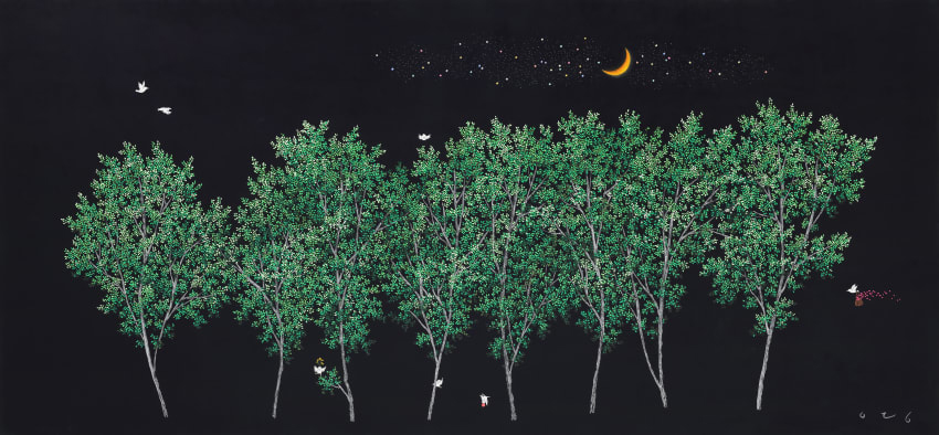 포근한 어둠이 찬란해 The warm darkness sparkles with brilliance, 2025, 장지 위에 분채 Powdered pigment on Korean paper 97 x 194cm