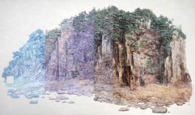 대강면2, 천 한지(한지+천)에 먹, 아크릴릭, 호분_97x162.2cm_2025