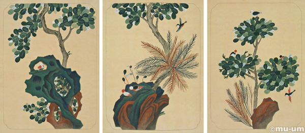 나무와 돌과 새이야기09-4, 장지에 채색, 73x53cm x3, 2009