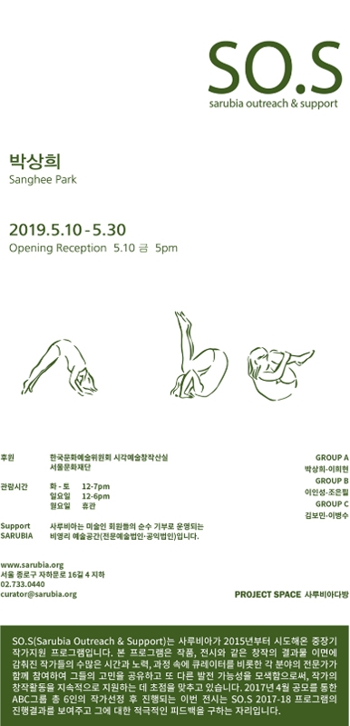 그렇다면 왜 작가는 이런 전시방식을 선택하였을까? 작가라면 누구나 작업은 시작점에서부터 끊임없는 변화를 겪어 온다. 또한 작가로서 사람들에게 주목을 받기도 했을 것이고, 좌절하기도, 예술가로써 처한 창작의 고민 이외에 삶의 환경에 대한 고민도 해왔을 것이다. 이는 실제적으로 작업에 드러나기도 하지만 그렇지 않은 경우들이 더욱 많다. 그 만큼 자신의 예술관을 세우고, 이를 유지해 나간다는 것은 모든 예술가들이 가진 어려운 일이다. 이는 박상희 작가가 프로젝트 스페이스 사루비아 다방의 프로그램인 SO.S 프로그램에 참가한 이유이기도 할 것이다. 그렇기에 이 전시는 프로그램에 참여하는 2년여의 시간 동안 전문가들과 함께 나눈 내면적 고민들이 응축되어 나타난 것으로 보인다. 특히 전시장 입구에서부터 보이는 <앞 구르기>는 그가 고민 했던 작가적 시간에 대한 의미들을 함축적으로 보여준다. 앞 구르기는 앞을 향해서 굴러가지만 일어서서 내가 제대로 가고 있는지 확인하지 않으면, 어디로 가는지는 돌고 있는 동안에는 전혀 알 수가 없다. 또한 앞 구르기를 처음 시도할 때에는 긴장과 불안함을 느낀다. 아마도 그의 작가적 삶도 앞 구르기를 하다가 확인하고 다시 구르고 또 확인하기를 반복하는 과정이었을 것이다. 이는 누구도 대신 해줄 수 없는 것이기에 혼자만의 고민으로 점철된 자기 수행의 시간이다. 이렇게 전시장에서 그가 보여주고자 하는 것은 지금까지 해온 작업에 대한 내용과 기법과 같은 것이 아니라 작가로써 응축된 심리적인 풍경이다. 그는 필자와의 인터뷰에서 자신은 너무 밖을 보려고만 했었다 라고 이야기 했듯이 SO.S 라는 특별한 프로그램을 통해 자기 자신의 내면을 되돌아보고 직시하기 위한 계기로써 이번 전시를 사용하고 있다. 지금까지의 그의 작업들은 창작자 주체의 감성을 드러내기 보다는 자신의 주변을 관찰하고 이를 조형적으로 객관화하여 특수한 도시에서 만나게 되는 삶의 환경에 대한 감각들을 관객에게 전달하였다. 그러나 이번 전시장을 구성하고 있는 설치 작업과 같은 모습은 과거에부터 현재의 작업을 단순하게 나열하는 것이 아니라 지금껏 내면에 감추어 두었던 작가 개인의 감정들을 공간 그 자체로 확장시켜 표현하고 있다. 따라서 우리가 오히려 주목해야 하는 것은 전시장에 들어서면 온전히 드러나는 박상희만의 회화적 공간이다.