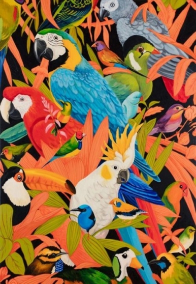 Blue, Red, and White Parrots, 2019, Oil on Canvas, 112x162cm