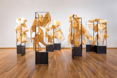 Wandering Still - Cascade, 2017, On-site installation at Kumho Museum 30 steel frames: 190 x 45 cm each Jangpanji, handmade Korean traditional paper, Photo by Kim Inchul