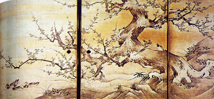 그는 도안을 단순화했기 때문에 자연에서 커다란 제재, 즉 새·동물·나무·꽃·바위 등을 즐겨 선택하여 이를 성(城)이나 사원의 실내장식에 쓰이는 큰 병풍(屛風)이나 미닫이에 그렸다.