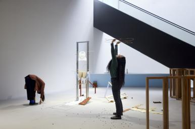 <체력 단련 활동장>은 원형 트랙과 무늬목 마루, 곡선 평균대와 공중 그네, 클라이밍 벽으로 구성되어 놀이터, 체육관, 서커스장을 뒤섞어 놓은 작가의 신작이다. 다양한 목공 기술을 융합해 만든 기구들은 또한 짜맞춤 기법 등 사라져가는 목공의 역사를 소환한다. 작가는 일련의 제작과정과 그가 만든 기구에서 곡예를 펼치는 여성 서커스 아티스트의 모습을 영상에 담아 함께 전시한다. 쉼 없는 단련을 통해 신체적, 물리적 한계를 시험하고, 잊혀져 가는 기술과 전통을 이어가며, 여성성의 틀과 사회적 편견에 도전하는 자신의 활동을 ‘곡예’에 비유하고, 그와 유사한 경험을 공유하는 이들의 노력을 조명하고자 하는 것이다.