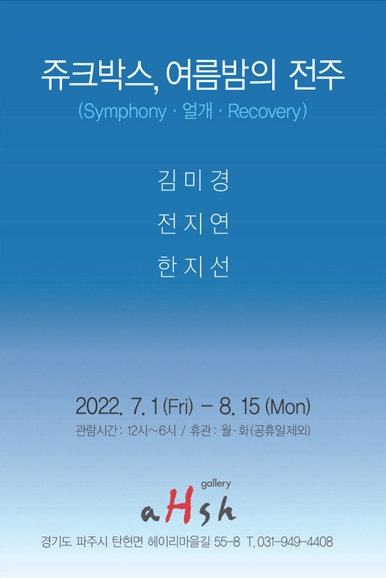 김미경, 전지연, 한지선 작가의 Symphony · 얼개 · Recovery 작품제목처럼 궁극적 목표는 힐링이고 회복을 의미한다. 찐 언니들의 수다 속에서도 일상에서도 우리에게 필요한 것은 쉼이고 화해이고 치유이다. 쥬크박스의 멜로디처럼 조금은 천천히 가끔은 어눌하게 그러나 진심으로 이 시간들을 살아가기를 희망한다.