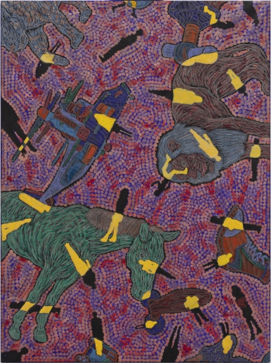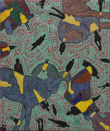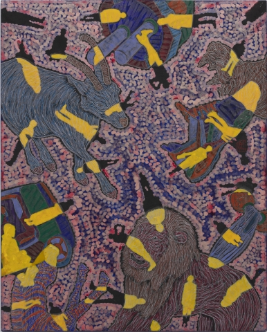 Although Hur’s paintings are different from those by Wang Meng in terms of subject matter and expression, their paintings share distorted light and shade, deformed images, sensitive brushstrokes, and unstable compositions. Hur Jin completed his scenes in which the opposing senses of dynamism and homogeneity coexist, overlapping reversal and antagonism. He illustrated a large group of floating people and rocks in Nomadic Animal+Human_Civiilization he recently made public. While the people were treated in a simple way, the rocks were finished in ink and brush techniques. An overlap between humans and animals was painted in yellow, contrary to the background painted in black. The yellow bodies overlapping with animals look like a blank spaces with holes.
