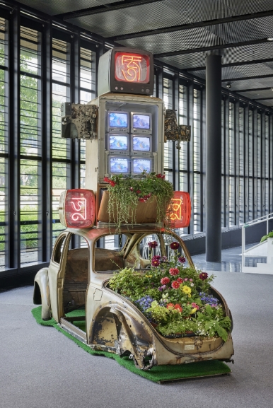 마르코 폴로, 1993, 330×160×370cm, 자동차 본체, 냉장고, TV 모니터 6대, 네온, 생화 외 기타, 1-채널 비디오, 컬러, 무성, 아모레퍼시픽미술관 소장